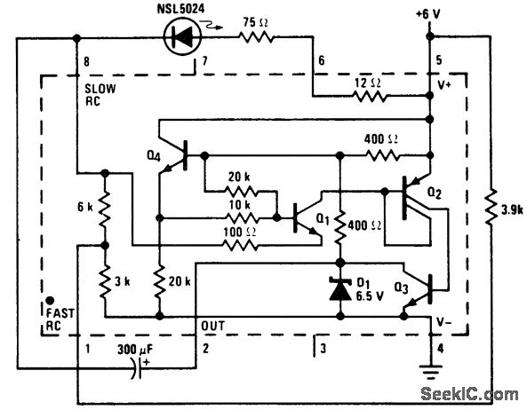 6-volt flasher using an LM3909 chip. Flashing rate is about 1 hertz. Circuitry inside dashed lines is the LM3909 (courtesy National Semiconductor Corporation).