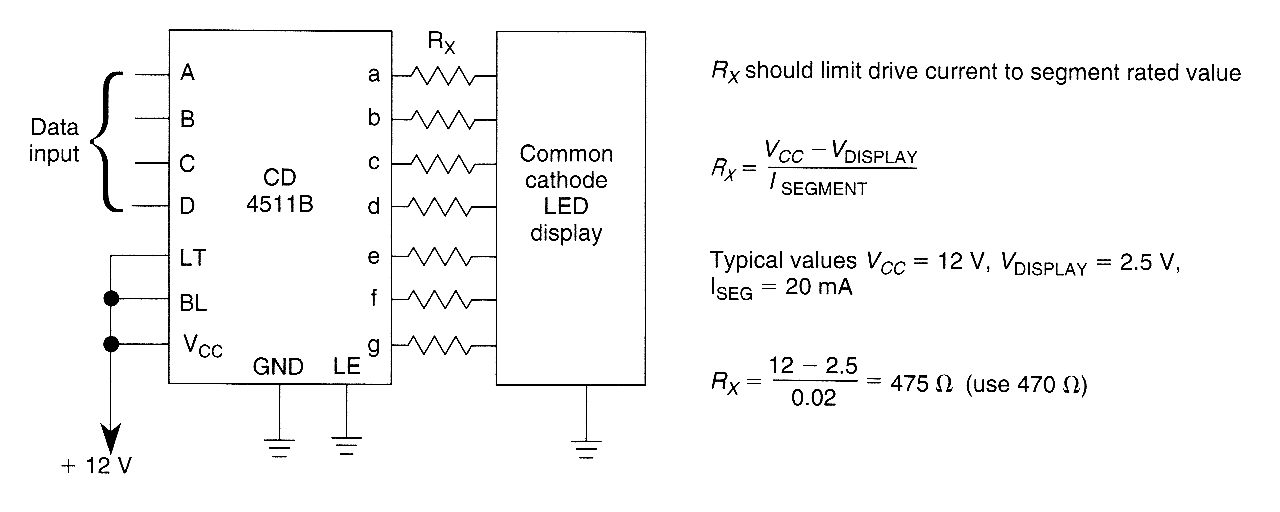 A CD4511B CMOS LED display driver can be used to drive a common cathode LED display. Cur-rent limiting resistors limit the segment current to the rated value at maximum supply voltage. A sample calculation is shown.