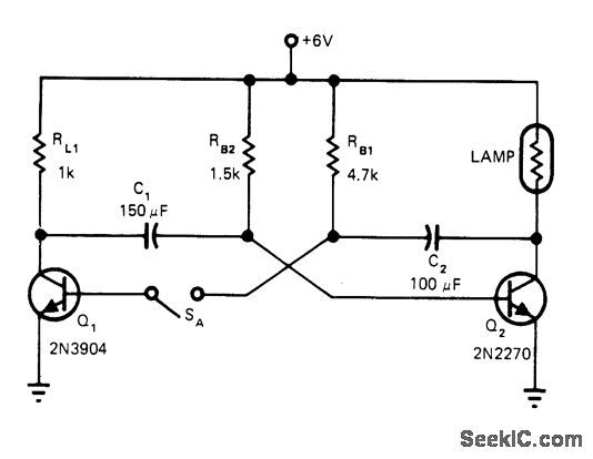 Simple two-transistor flasher circuit for annunciator system is activated by alarm. Operator acknowledges alarm condition by depressing SA, which changes lamp from flashing to steady ON condition. 6-V incandescent lamp draws about 0.3 A through Q2, but 1K load resistor for Q1 limits current of this transistor to about 6 mA so smaller transistor can be used.-T. Stehney, Flasher Design Cuts Extra Components, EDN Magazine, Sept. 20, 1978, p 144.