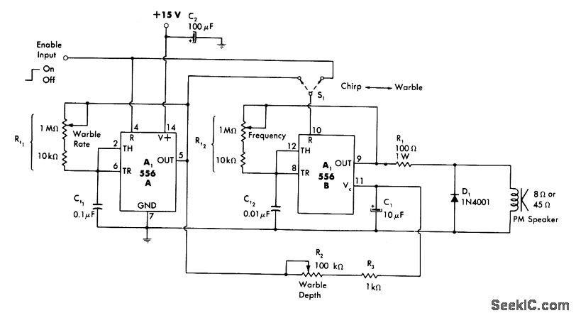 Provides attention-getting chirp sound, warble, or continuous tone when turned on by high input from burglaralarm sensor circuit. Second section of 556 timer provides optional frequency modulation of basic tone to give warbling effect. Chirp is achieved by gating tone oscillator on only during high states of warble oscillator. Aural sensitivity is maximum in range of 1-2 kHz, set by value of Rt2.-W. G. Jung, IC Timer Cookbook, Howard W. Sams, Indianapolis, IN, 1977, p 232-235.