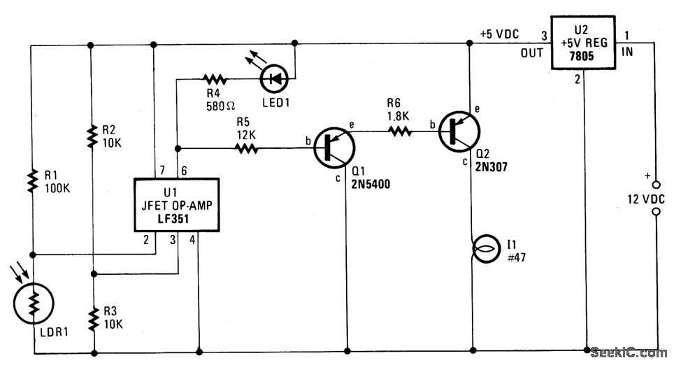 Integrated-circuit U1-an LF351 or 741 op amp-is used as a comparator to control the light. Resistors R2 and R3 provide a reference voltage of about 2.5 volts at pin 3 of U1. When daylight falls on light-dependent resistor LDR1, its resistance is low: about 1000 ohms. In darkness, the LDR's resistance rises to about 1 megohm. Since R1 is 100,000 ohms, and the LDR in daylight is 1000 ohms, the voltage ratio is 100 to 1; the voltage drop across the LDR is less than the 2.5 volt reference voltage and pin 2 of U1 is held at that voltage. In that state, the output at pin 6 of U1 is positive at about 4.5 volts, a value that reverse-biases Q1 to cutoff, which in turn holds Q2 in cutoff, thereby keeping lamp I1 off. When darkness falls, the LDR's resistance rises above R1's value and the voltage at pin 2 of U1 rises above the reference voltage of 2.5 volts. U1's output terminal (pin 6) falls to less than a volt and Q1 is biased on. The base-to-emitter current flow turns Q2 on, which causes current to flow through the lamp. When daylight arrives, the LDR's resistance falls sharply, which causes the lamp to be turned off, ready to repeat the next night/day cycle.