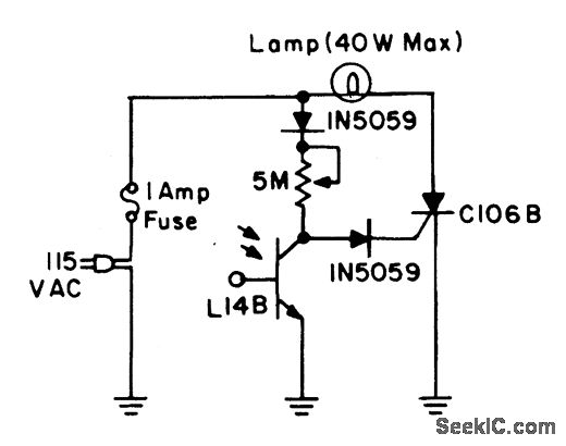 During daylight hours, the L14B photo-Darlington (JEDEC registered as 2N5777 through 2N5780) shunts all gate current to ground. At night, the L14B effectively provides a high resistance, diverting the current into the gate of the C106B and turning on the lamp.