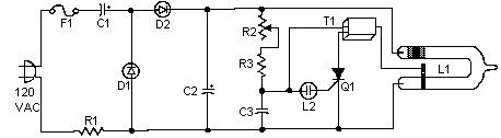 PartsR1 250 Ohm 10 Watt ResistorR2 500K PotR3 680K 1/4 Watt ResistorD1,D2 1N4004 Silicon DiodeC1, C2 22 uF 350V CapacitorC3 0.47uF 400 Volt Mylar CapacitorT1 4KV Trigger Transformer (see Notes )L1 Flash Tube (see Notes )L2 Neon BulbQ1 106 SCRF1 115V 1A FuseMisc Case, Wire, Line Cord, Knob For R2Notes1. T1 and L1 are available from The Electronics Goldmine2. This ciruits is NOT isolated from ground. Use caution when operating without a case. A case is required for normal operation. Do not touch any part of the circuit with the case open or not installed.3. Most any diodes rated at greater then 250 volts at 1 amp can be used instead of the 1N4004's.4. Do not operate this circuit at high flash rates for more than about 30 seconds or else C1 and C2 will overheat and explode.5. There is no on/off switch in the schematic, but you can of course add one.