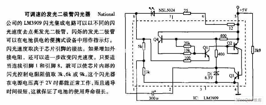 National's LM3909 flashing IC flash can light the light-emitting diode in different rates, and the flashing LED is used as indicator in the battery-powered portable devices. Flashing speed depends on the chip pin connection. If it increases an external resistor, the flashing rate can be further improved. If the connection of pin 1 and pin 8 is appropriately, you can make the chip internal controlling resistor take 3K, 6K, or 9K. The flashing device can work normally with the power supply voltage higher than 2V, but the lead time is very short, which ensures long battery life.