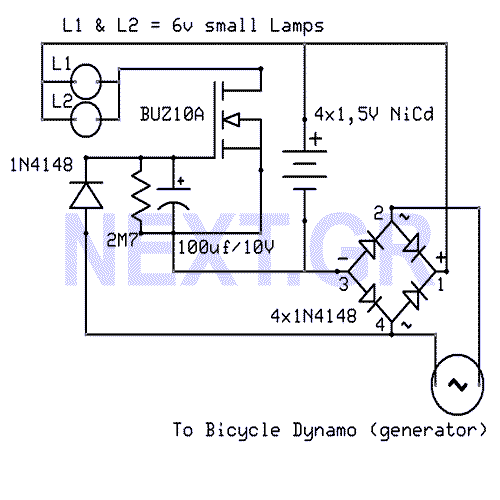 That Circuit is an advanced bicycle lighting system which will power your lights and also charge four NiCd batteries while you running in the streets, for keeping the lights on while the bicycle is stoped. Its fully automated without any switches.