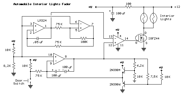 The top two opamps (pins 1,2,3 and 5,6,7) form a triangle wave oscillator running at about 700Hz while the lower opamp (pins 8,9,10) produces a linear, 5 second ramp, that moves up or down depending on the position of the door switch. The two transistors and associated resistors serve to limit the ramp voltage to slightly more and less than the upper and lower limits of the triangle waveform. These two signals (700 hZ. triangle wave and 5 second ramp) are applied to the inputs of the 4th opamp (pins 12,13,14) that serves as a voltage comparator and generates a varying duty cycle square wave that controls the IRFZ44 MOSFET and lamp brightness. The 5 second fade time can be adjusted with the 75K resistor connected to the door switch. A larger value will increase the time and a smaller value will speed it up.
