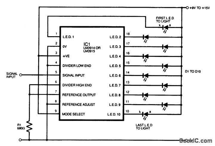 This shows how an LM3914 or LM3915 is connected for 9- to separate LEDs or part of an integral display module.