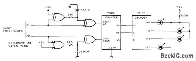 Apparent rotation of dot on four-LED display gives indication of beat frequency between ttnro tone oscillators.When F1 is greater than F2, dot rotates clockwise. When F1 is less than F2, dot rotates coun torclockwise. When F1 equals F2, dot does not move.-Circuits, 73Magazine, July 1977, p 35.