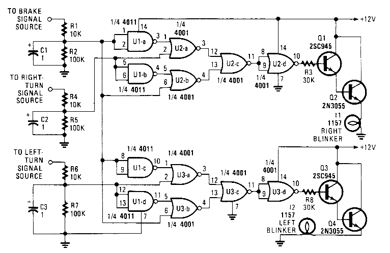 This circuit enables single-filament tail lights to serve as combination brake lights and turn signals.