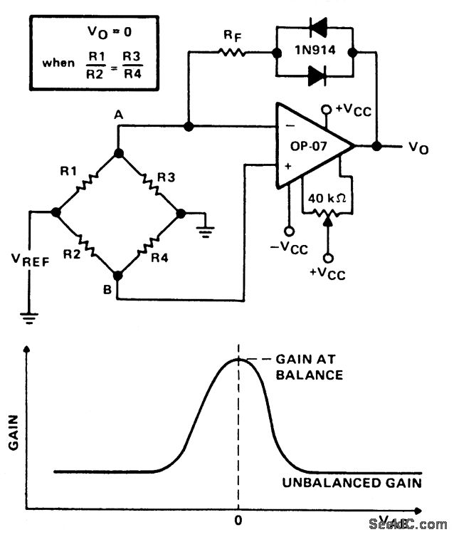 Indicator provides an accurate comparison of two voltages by indicating their degree of balance (or imbalance). Detecting small variations near the null point is difficult with the basic Wheatstone bridge alone. Amplification of voltage differences near the null point will improve circuit accuracy and ease of use.The 1N914 diodes in the feedback loop result in high sensitivity near the point of balance (R1/R2=R3/R4). When the bridge is unbalanced the amplifier's closed-loop gain is approximately RF/r, where r is the parallel equivalent of R1 and R3. The resulting gain equation is G = RF(1/R1+1/R3). During an unbalanced condition the voltage at point A is different from that at point B. This difference voltage (VAB), amplified by the gain factor G, appears as an output voltage, As the bridge approaches a balanced condition (R1/R2 = R3/R4), VAB approaches zero. As VAB approaches zero the 1N914 diodes in the feedback loop lose their forward bias and their resistance increases, causing the total feedback resistance to increase. This increases circuit gain and accuracy in detecting a balanced condition. The figure shows the effect of approaching balance on circuit gain. The visual indicator used at the output of the OP-07 could be a sensitive voltmeter or oscilloscope.