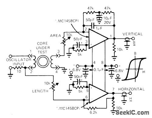 Low-cost dual opamp circuit allows display of hysteresis loop on call-brated XY oscilloscope. Two windings are placed on core to be tested, with opamp of fluxmeasuring system connected to secondary for deriving vertical deflection input representing flux B. Artide gives design equations and details of circuit operation and use.-D. A. Zinder, X-Y Oscilloscope Displays Hysteresis Loop of Any Core, EDN Magazine, Feb. 5, 1975, p 54-55.