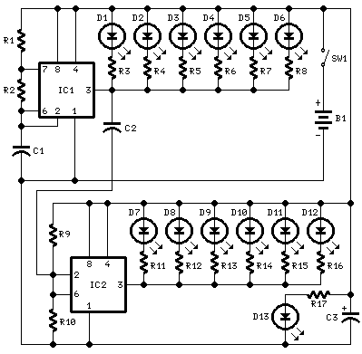 Circuit operation:IC1 is a CMos version of the 555 IC wired as an astable multivibrator generating a 50% duty-cycle square wave at approx. 4Hz frequency. At 3V supply, 555 output (pin 3) sinking current operation is far better than sourcing, then LED D1-D6 are connected to positive supply. In order to obtain an alternate flashing operation, a second 555 IC is provided, acting as a trigger plus inverter and driving LEDs D7-D12. D13 is permanently on.The LEDs are arranged in a two series display as shown below, with a center LED permanently on. This arrangement and the alternate flashing of the two series of LEDs provide a pseudo-rotating appearance.