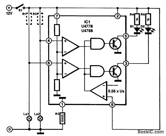 If a small resistance is connected in series with a bulb, a small voltage drop will develop across it when the bulb lights (R1 and R2 in the diagram). Each IC can cope with only two bulbs, so three or four ICs are needed per car. The junction of the bulb and resistor is connected to one of the inputs (pin 4 or pin 6) of the IC. The potential across the resistor is compared in the IC with an internal reference voltage. Depend-ing on which of the tWo ICs is used, the voltage drop must be about 16 mV (U477B) or 100 mV (U478B). This voltage drop is so small that it will not affect the brightness of the relevant bulb.