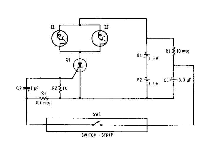 Capacitor Cl is connected continuously through the supply of 3 volts to 10 megohm resistor Rl. The capacitor is charged (relatively slowly) to 3 volts. The wink SWI is closed, it connects the charged capacitor (Cl) in series with C2 and R2. The capacitor C2 begins to charge, by placing a positive voltage during the gate of the SCR and turn it on. The two parallel self-flashing bulbs I1 and 12 on Tum. They flash on and off the SCR and the circuit is turned off until the vehicle is driven off the switch and C1 can recharge.