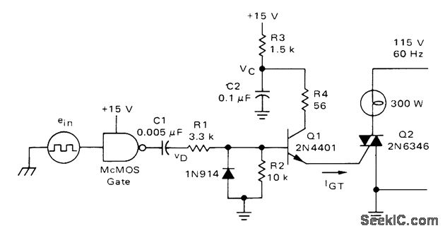 Storage capacitor C2 in interface transistor circuit for typical CMOS gate charges to full +15 V supply voltage in time determined by R3 and C2, after which al is fired by positive-going differentiated pulse derived from input square wave. C2 then dumps its charge through R4 and C1, to fire triac C2 and energize AC load. For maximum load power, triac should be fired early in conduction angle. With 1-kHz input square wave, output power is over 98% of maximum possible.-A. Pshaenich, Interface Techniques Between Industrial Logic and Power Devices, Motorola, Phoenix, AZ, 1975, AN-712A, p 13.