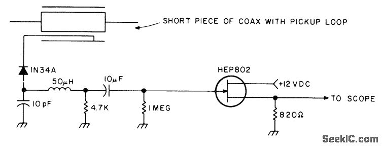 Permits monitoring transmitted amateur televison I signals with oscilloscope for such applications as checking sync levels and sync-pulse shape Outgoing signal can be monitored while adjusting modulator -Circuits、73 Magazine, March 1977 p 152.