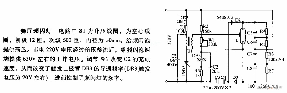B1 in the circuit is step-up coil and hollow coil, and the primary is 12 turns with the diameter in 10mm, and it provides high voltage for strobe bubble. 220V mains voltage is voltage-multiplied and rectified to provide about 630V operating voltage at both ends of the strobe bulb. Adjusting W1 can change the charging rate of C2, thus it changes the trigger diode CB3 conduction frequency (DB3 trigger voltage is about 20V), thenit can control the strobe's frequency.