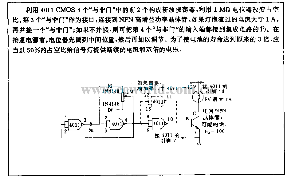 Chopped wave oscillator is composed of the first two 4011 CMOS four NAND gate , the duty ratio is changed by 1MΩ potentiometer. As interface, the third NAND gate is connected to NPN high gain power transistor. If the bulb's current is higher than 1A, then paralleling a NAND gate ; if it does not parallel, you can connect the input terminal of the fourth NAND gate to IC's (14). Before power supply is turned on, potentiometer is adjusted to the middle position, then it can be regulated. In order to make the battery life 3 times longer than before, it should provide singal light discontinuous current and double voltage with 50% duty ratio.