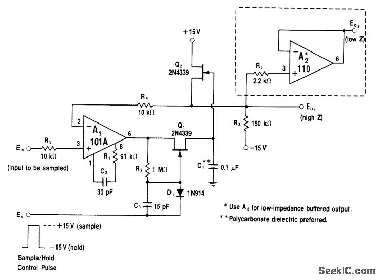 FET Q2 serves as buffer for hold capacitor C1, minimizing droop error. Switching transistorQ1 is placed in feed-back loop. A1 serves as input signal buffer and as driver for Q1 and C1. When sample line is raised to +15 V by control pulse, D1 is reverse-biased and a, is turned on C1 now charges until output terminal reaches equilibrium with input (so A1 is tracking input). When sample pulse goes low, feedback loop of A1 is opened; output of A1 stays at voltage last sampled since C1 retains its charge and Q2 buffers this voltage while presenting it to output. Optional voltage follower can be used if more output current is needed to feed low-impedance load.-W. G. Jung, IC 0p-Amp Cookbook, Howard W. Sams, Indianapolis, IN, 1974, p 198-200.