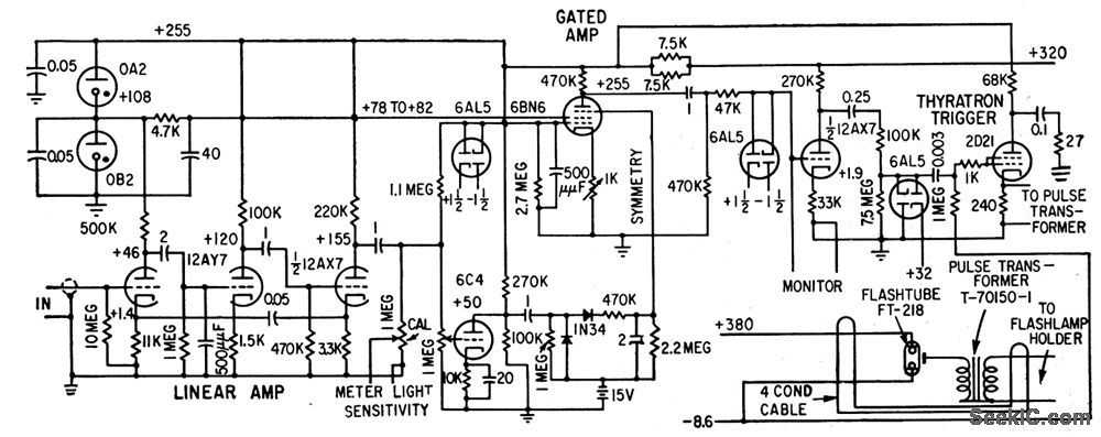 Uses 2D21 thyratron switch to discharge capacitor across primary of high-vohage pulse transformer whenever thyratron is fired. Resulting pulse is applied to trigger electrode of flashtube. Fires reliably up to 60 times per second. Used to illuminate number on aluminum indexing wheel on spinning shaft of magnetic gage used to locate exact position of ferromagnetic barrier encapsulated in shaped-charge container.-P. Seward, Magnetic Gage Locates Encased Metal Parts, Electronics, 31:33, p 65-67.