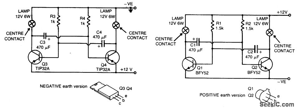 The flashing action is provided by a simple astable multivibrator timed to give a flashing rate of about 60 flashes for each lamp per minute. Circuit for positive earth systems uses NPN transistors. The other uses PNP transistors.