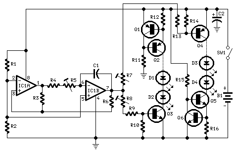 Circuit operation:The two Op-Amps contained into IC1 form a triangular wave generator. The rising and falling voltage obtained at pin #7 of IC1 drives two complementary circuits formed by a 10mA constant current source (Q1, Q2 and Q5, Q6) and driver transistor (Q3 and Q6).R4, R5 & C1 are the timing components: the total period can be varied changing their values. R7 & R8 vary the LEDs brightness.