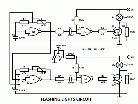 This flashing lights circuit can be used as beacon. The assembly consists basically of two blinking steps that commands two light bulbs. With the help of P1 you can adjust the flashing frequency between some limits.There are 2 parts for the circuit, the second one works the same way as the other but with the help of a wire bridge or a switch you can choose different operating modes.A bridge between M and 3 means: 2 independent blinks.If there is a bridge between M and 2, then the lamps lights alternatively with a frequency that can be adjusted with P1. And finally there is one more possibility for M and 1, where the lamps blinks at the same time.