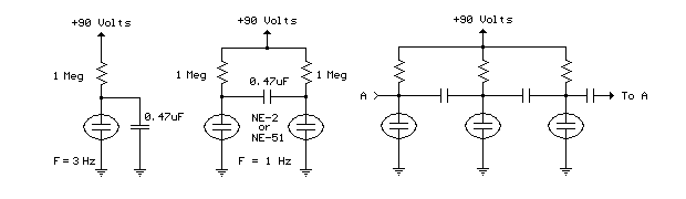 In this circuit, one, two or three neon indicator bulbs can be made to flash in sequence at rates determined by the R and C values. In the single stage circuit, using one lamp, the capacitor charges through the resistor until the ionization potential of the neon is reached (about 70 volts) and then discharges quickly through the lamp until the voltage falls below what is needed to sustain the lamp which is approximately 45 volts. The cycle then repeats at a rate of about 3 Hz for values shown. Smaller R or C values increase frequency, larger values decrease frequency. All capacitors should be the non-polarized variety with a 100 volt or more rating. For more than 3 stages, the lamps may need to be matched for similar turn-on voltages.