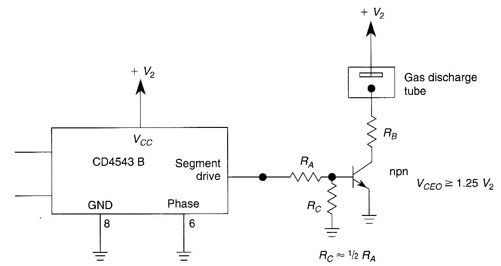 To drive the display, RA should provide a drive of about 1 mA to the gas discharge tube. RB is a current-limiting resistor.