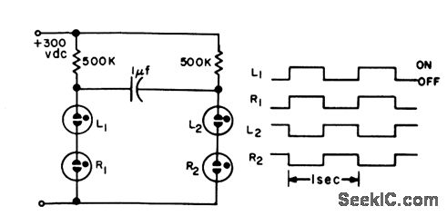 Neon lamps blink alternately in eyes of pumpkin for 0.5-sec duration, with 0.5 sec between blinks. Will also serve as roadsid blinker .Although NE2's can be used, LNE17's can be brighter and more effective.-More Glow.Lamp Circuits, EEE, 12:2, p 106-108.