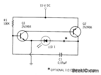 Circuit operates as regenerative amplifier for delivering 10-μs pulses with amplitude of 1.1 A and repetition rate of 1.4 kHz to infrared LED. Suitable for infrared beacon in fiber-optic communication and optical radar applications. Drain is 100 mA from 10-V supply. Use gallium arsenide LED such as SSL-55C or TIL32 for high-output infrared transmitter. Q2 can be changed to ger manium transistor such as 2N1305 to give peak current of 2 A at pulse width of 15 μs and 750-Hz repetition rate.-F. M Mims, Electronic Circuitbook 5: LED Projects, Howard W. Sams, Indianapolis, IN, 1976, p 33-35.