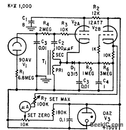 Prf rate of blocking oscillator, controlled by photocell output, can be transmitted over telephone lines to give accurate remote indication of day-light or other light intensity. D1, V2B, and meter provide local indication. Maximum illumination gives highest prf.-E. F. Hasler and G. Spurr, Ways to Measure Light Intensity at a Distance, Electronics, 32:29, p 48-49.