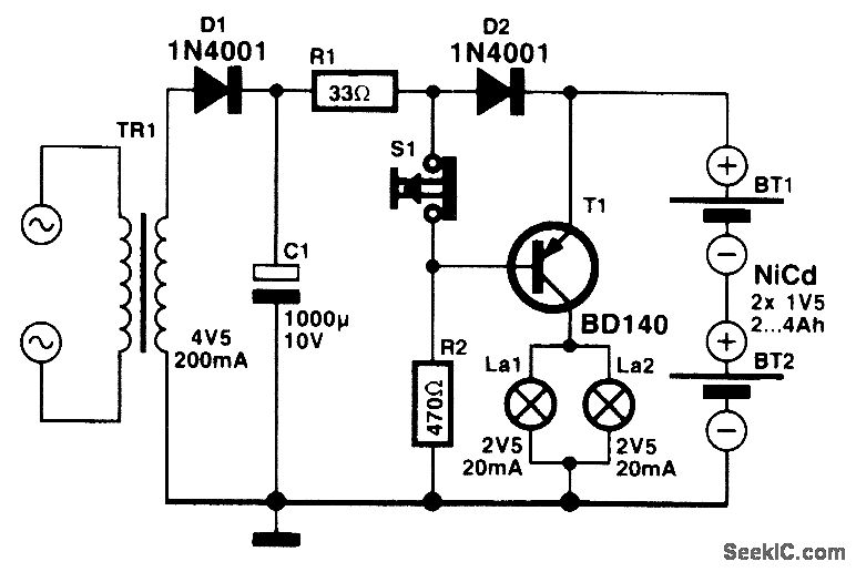 This low-cost circuit charges two nickel-cadmium cells to provide a standby power supply for a two-lamp emergency light, which is automatically switched on in the event of a power failure. Diode D1 and smoothing capacitor C1 form a conventional single-phase rectifier circuit with an output voltage of about 6 V. This voltage is used to continuously charge two series-connected NiCd batteries with a current of 80 to 100 mA, which flows via R1 and D2. At this rate, a 2-Ah (ampere-hour) NiCd battery can be safely charged for extensive periods. The voltage drop across D2 reverse-biases the base-emitter junction of PNP transistor T1. Consequently, the transistor is turned off, and the lamps connected, to its collector do not light. When a power outage occurs, T1 is supplied with base current (from the batteries) via R2, whereupon the miniature lamps are turndd on. As soon as the power is restored, T1 is switched off again, and the batteries are charged again via RI and D2.