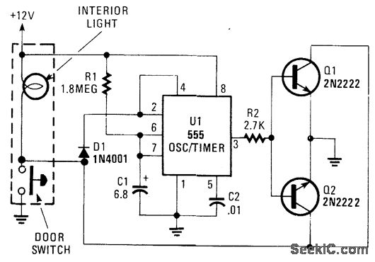 When the door is closed, this circuit keeps the dome light on for a period determined by R1/C1. The time is approximately (1.1)R1 x C1.