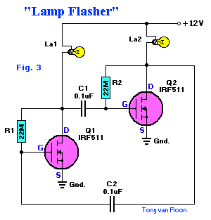Incandescent Lamp Flasher using two IRF511 HexFets which are configured as a simple astable multivibrator to alternately switch the two lamps, La1 and La2, on and off. The R & C values given set the flash rate to about 1/3 Hz. By varying either the resistor or capacitor values almost any flash rate can be obtainded. Increase either C1 and C2, or R1 and R2, and the flash rate slows. Decrease them and the rate increases.Unlike most semiconductor devices, the power MosFet can be paralleled, without special current-sharing components, to control larger load currents. That can be an important feature when the device is used to turn on incandescent lamps, because the lamp's cold resistance is much lower than the normal operating resistance.A typical #1815 12 to 14-volt lamp measures 6 ohms cold. When 12 volts is applied, the initial current drawn is 2 amps. The same lamp, when operating at 12 volts, requires only about 200mA. The hot resistance figures out to be ten times its cold resistance, or 60 ohms. That tidbit should be considered when picking any semiconductor device to control an incandescent lamp.
