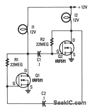 The circuit is built around two power FETs, which are configured as a simple astable multivibra-tor to alternately switch the two lamps on and off. The rc values given sets the flash rate to about 1/3 Hz. By varying either the resistor or capacitor values, almost any flash rate can be obtained. Increase either C1 and C2, or R1 and R2, and the flash rate slows. Decrease them and the rate increases.