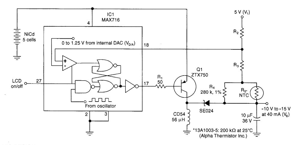 Negative temperature-coefficient resistor R5 modifies feedback in this switching regulator, which results in a negative output voltage that varies with temperature. With properly chosen resistor values, the circuit produces a temperature compensated bias voltage that ensures constant con-trast in an LCD.