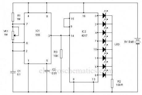This is the circuit of a simple LED chaser. The LEDs lights one by one for a period of 1second and the cycle repeats giving the running light appearance. The circuit uses two ICs (one is 555) to drive the LEDs.IC1 (NE555) is the popular timer IC wired in the Astable Multivibrator mode. Resistors R1, VR1 and capacitor C1 act as the timing components and the output pulses are available from the output pin 3 of IC1. These pulses are given to the input pin 14 of the Johnson decade counter IC CD4017. Out of the 10 outputs of IC2, eight outputs are used to drive the LEDs. The ninth output pin 9 is connected to the reset pin 15 to stop the counting. So that the cycle repeats. With the value of C1, each LED remains on for 1second. When one LED turns off, the second on turns on. This cycle repeats giving the running light appearance. Resistor R3 keeps the input pin 14 of IC2 low after each pulse.VR1 adjusts the speed of LED chasing.