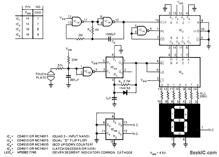 When positive bias on input of IC1D number displayed. Number can be between 1 NAND gate is puiied to ground by skin resistance of finger, D flip-flop IC2A connected as mono is triggered. Pin 1 goes high for about 2 s, making IC4. latch outputs of counter IC3 andunblank LED display. Randomtime that fingeris on touch plate determines randomness of number displayed. Number can be between 1 and9, between 1 and 6 for die,between 1 and2 to representheads or tailsChange BCDof jam inputs of IC3 to highest random number desired .Values shown are for 4.5-V supply and dispiay current of 10 mA PER SEGMENT. LEDisblanked until plateis touched Standby current drain of 10 μA on three AA alkaline cellsis so low that ON/OFF switch is unnecessary.-C,Cullings,Electronic Die Uses Touchplate and 7Segment LED Disρlay,EDN Magazine,May 20,1975、p70 and 72.
