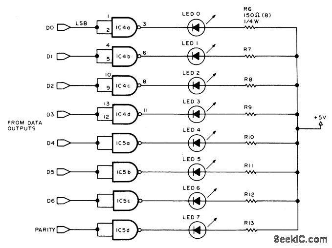 Shows code for any ASCLL keyboard character as aid in debugging keyboard matrix wiring. Requires only two 7400 quad NAND gates, eight resistors, and eight LEDs. High input to gate forces output low, grounding LED and lighting it. On standby with positive logic, all LEDs are lit with negative logic ,all are dark on stangby .arrange LEDs on keyboard so rightmost LED represents least significantbit (DO)and leftmost LED represents parity bit. Using positive logic, ASCLL code for any depressed key will show as lit LED for 1 and dark LED for o. Pin 14 of 7400 is +5 V, and pin 7 is ground.-B. Brehm. Using a Keyboald ROM, BYTE, May 1977, p 76-.82.