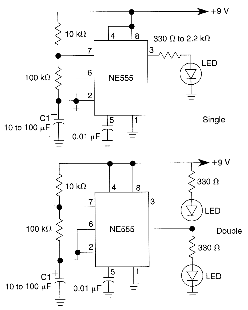 A 555 is used to switch an LED on and off. C1 determines the flash rate. Single ended (one LED) and double-ended (altemating) flashers are shown.