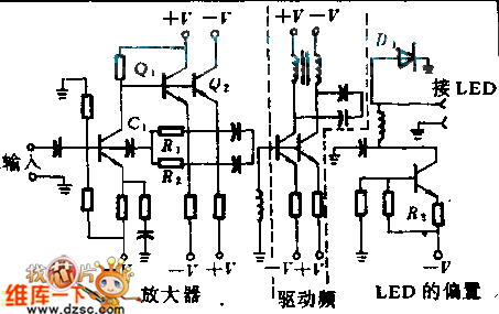 In analog system, the LED's linearity is required highly. But the linearity is different for different LED and the linearity would change as the temperature changing. This control circuit's LED driver and signal-amplifier circuit can keep the LED's linearity. The amplifier uses a couple of complementary transistors Q1 and Q2 for using to further reduce the secondary distortion. By the R1, R2 and C1's feedback it provides a 75Ω input resistance. The amplifier would send the input signal to a couple complementary driver and the driver's collector polar would output AC coupled signal on the LED. By appropriate choice of R3 it can adjust the bias current.