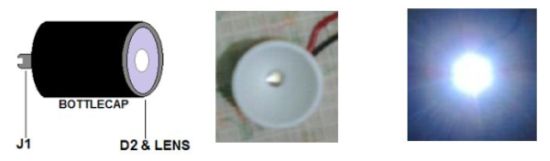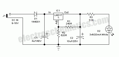 Here is a very useful workbench lighting unit for electronics hobbyists. The portable inspection lamp circuit consists of an on-board voltage regulator and a high-bright 5mm white LED. Any 9 to 18 volt dc rated ac mains adaptor, capable to source about 100 mA of output current can be used to power this portable inspection lamp.After contruction the led workbench light circuit should be enclosed in a suitable plastic bottle cap as illustrated here. The miniature lens shown is an optional component. In the prototype, plastic made lens lifted from a discarded torch was used!The adjustable 3-pin voltage regulator IC1 (LM317L) in TO-92 pack, is here tuned to supply an output of near 4.5 volt dc. This supply is directly fed to the white LED (D2) through the current limiter resistor R3 (51 Ohm). Diode D1 (1N4001) works as an input polarity protection guard and two small electrolytic capacitors (C1 and C2) connected at the input and output pins of IC1 improves the overall stability of the regulator circuit. Use a standard RCA or EP socket as the input terminal J1.