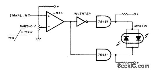 Uses Monsanto MV5491 dual red/green LED, with 220 ohms in upper lead to +5 V supply and 100 ohms in lower +5 V lead because red and green LEDs in parallel back-to-back have different voltage re quirements. Circuit requires SN75451 driver ICs and one section of SN7404 hex inverter, with LM311 comparator. All operate from single +5 V source. Provides indicator change from red to green with input change of only a few millivolts.—K. Powell, Novel Indicator Circuit, Ham Radio, April 1977, p 60-63.