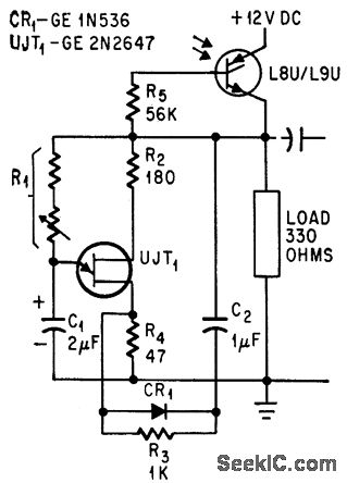 Boot-strapped unijunction transistor interrupts load current at desired delay interval (determined by R1 and C1) after short pulse of light hits glass-window scr L8U.-E. K. Howell, Light-Activated Switch Expands Uses of Silicon-Controlled Rectifiers, Electronics, 37:15, p 53-61.