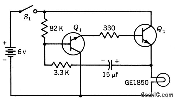 Q1 is operated in inverted configuration for lower leakage current. Typical on time is 0.2 sec and off lime 0.8 sec. Q1 is 2N132 and Q2 is 2N1374. Can be used as construction barricade flasher, flashing single lamp at 1 cps for up to 60 days on single battery. Use of solar-cell switch for S1, to turn off lasher automatically in daytime, will roughly double battery life in unattended locations.-Texas Instruments Inc., Transistor Circuit Design, McGraw-Hill, N.Y., 1963, p 425.
