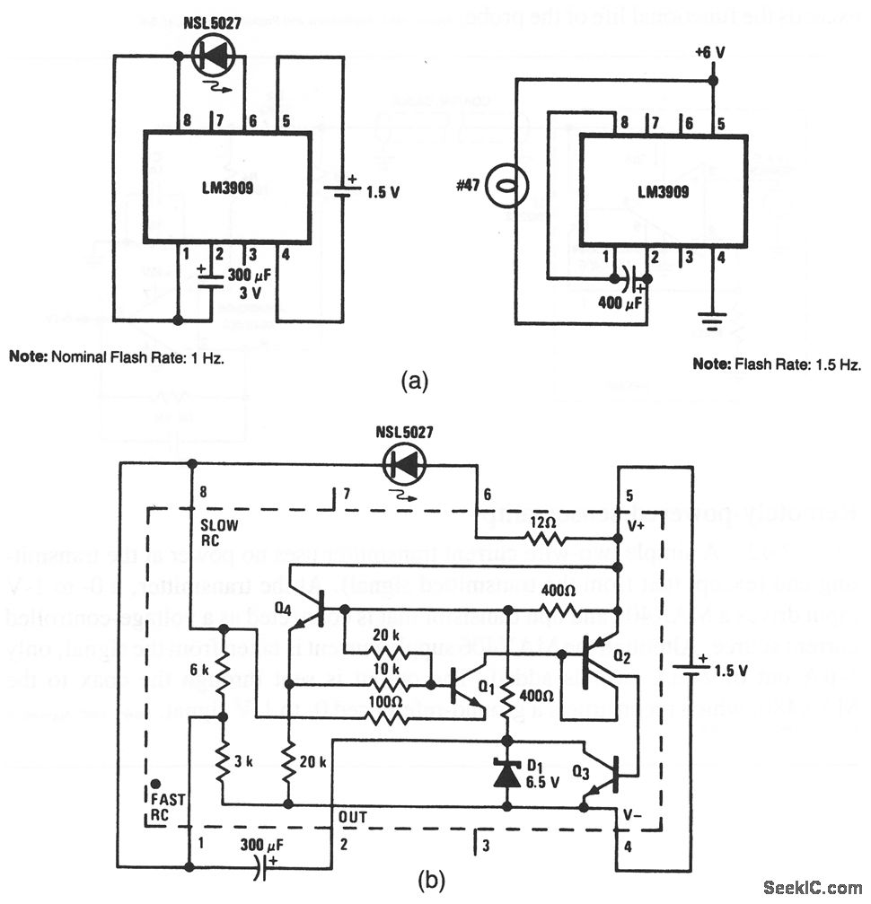 This circuit shows two simple flashers that use an LM3909. Figure 12-43B shows the internal circuit. Notice that the LM3909 requires only 1.5 V.However, 6 V is required when the LM3909 must drive a #47 lamp (or any similar load), instead of an LED. The flashing rate is determined by the value of the capacitor between pins 1 and 2. Iffiioo8l Semiconductor Linear Applications Handbook, 1991 p 394