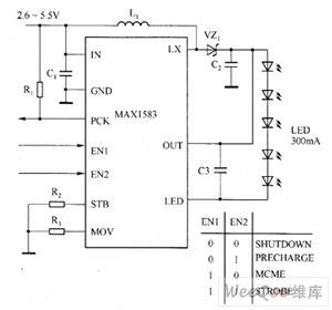 MAX1583 boost converter can drive five white LEDs by constant current, and it provides camera flash driver for mobile phone, PDA, DSC, and other portable electronic devices. MAX1583 includes a 24V boost converter and a high-voltage LD0 current regulator to achieve high efficiency and extend battery life. Its two logic inputs can be used to select the following four modes: shutdown mode, high efficiency, continuous flash movie mode, precharge mode, flash mode. MAX1583 uses the 10-pin 3mm × 3mm TDFN package (the maximum height is 0.8mm).