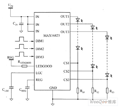 MAX16823's main technical characteristics are as follow. ① 5.5 ~ 40V operating voltage range. ② adjustable constant output current (5 ~ 70mA, it uses external BJT to reach 2A). ③ ± 5% output current accuracy. ④ white LED open detection. ⑤ 3 separate high-pressure DIM inputs. ⑥ Built-in 3-channel, low dropout (maximum value is 0.7V) and adjusting components. ⑦ undervoltage lockout function(output short-circuit protection and thermal shutdown). ⑧it contains 3.4V regulator to provide 4mA current. ⑨ low 203mV precision current-sense reference.