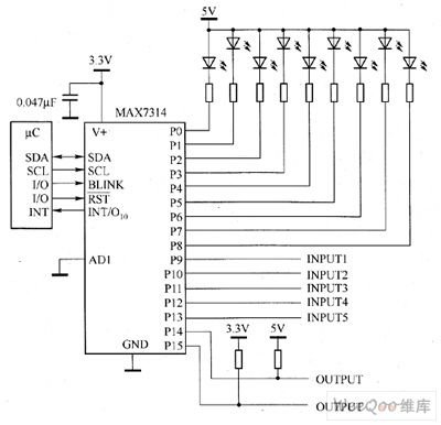 MAX7314's main technical characteristics are as follow. ① it has 400kbps, 2-wire serial interface, and the voltage is 5.5V. ② working voltage is 2 ~ 3.6V. ③ the total 8-bit PWM LED intensity control has a global 16-level brightness control with separate 16 additional brightness control, two-phase LED flashing. ④ it has Interrupt Output transition detection circuit, which can work in 5.5V open-drain output, each port's maximum output current is 50mA. ⑤ Input over-voltage protection is up to 5.5V. ⑥ operating current is typical 1.2μA, and the maximum value is 3.6μA. ⑦ it uses small 4mm × 4mm thin QFN package.